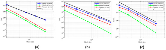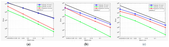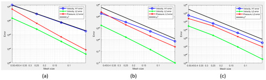 Depicted in Figure 3, Figure 4 and Figure 5, the error plots demonstrate a favorable convergence of the key parameters related to both the L2 and the H2 norms for various Re numbers. This convergence becomes evident as the mesh size of the square decreases, indicating an improvement in the accuracy of the results.