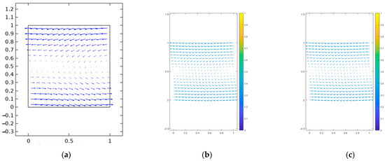 Velocity vector field representation: FEM approximate solution (a), IGA approximate solution (b), and exact solution (c).