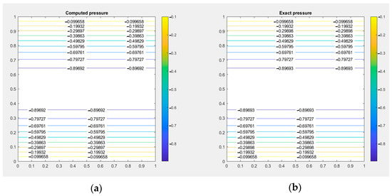 Furthermore, in order to validate the quality of these results, it is crucial to conduct a comparison between the velocity field and the pressure field obtained from the NURBS/FEM and the exact solution defined in the previous section. By performing this comparative analysis, we can assess the accuracy and reliability of the NURBS method [20] in accurately representing the physical phenomena under consideration (see Figure 6).