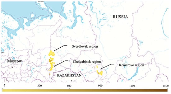 Concentration in traditionally large cities is a characteristic of the music professions, particularly in the case of the spatial center of Germany (Thuringia, Saxony, and Bavaria) []. Spatial heterogeneity is inherent in the mobility processes of celebrity chefs in China []. The spatial heterogeneity of publishing activity was revealed in the case of European regions []. These studies open a new research avenue, though they do not fill the gap in research, which is to establish the factors of creative industry concentration and its impact on urban development, which is especially relevant in modern conditions for single-industry towns in Russia.