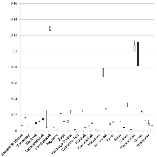 For comparison, there are over 2500 small industrial cities in the USA, 112 in Norway, and single-industry towns are also found in South Africa and China [,,]. The general pattern of the development of such cities is obvious—a high concentration of a particular type of activity, which influences other auxiliary processes in the economy and society, creating a special culture of a single-profile city []. Single-industry towns are characterized by the problems of the influence of the institutional path dependence [], which is formed as a result of lagging behind the placement of production forces from the emerging agglomeration effects []. They are characterized by the so-called “resource curse” or “paradox of abundance” []. However, the essence of the problems of single-industry towns is that although the concentration of productive forces in them is maximum, but contrary to the laws of the market economy it is formed far from under the influence of maximum agglomeration effects.