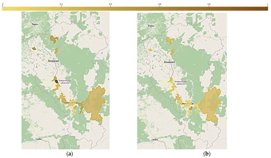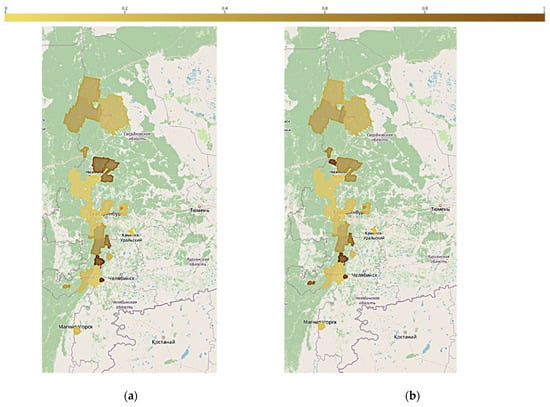 The dynamics of creative industries concentration in the single-industry towns of Sverdlovsk and Chelyabinsk region in 2013–2017: (a) 2013; (b) 2017 (a lighter red indicates a lower concentration and a greater variety of creative industries).