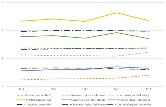 The Theil index is estimated separately for three regions, which allows us to assess the degree of differentiation of organizations’ revenues in the region, in order to assess whether concerns about the growth of spatial inequalities are justified in the current conditions of single-industry towns. The growth of this indicator will indicate an increase in spatial differentiation within the region (4).