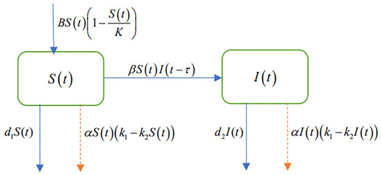 where and are the variables; B, , , , , , and K are the positive constants; and is the time delay of disease control to take effect. The specific descriptions are given in Table 1.