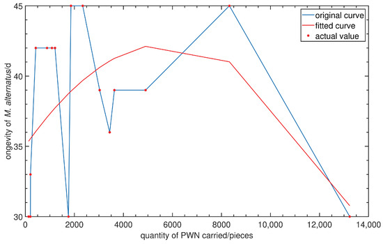 Based on the data in Table 2, we remove the maximum and minimum values of the PWN number carried by M. alternatus, and then plot the original curve and curve after quadratic fitting by interpolation, as shown in Figure 2.