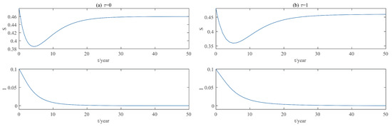 When , as we can see in Figure 3a, the number of infected M. alternatus will decrease rapidly in five years, and eventually, the infection would disappear completely. This case shows that when there is no time delay of the control to take effect, PWD will disappear. When , the solution is shown in Figure 3b. In this case, there is a time delay of the control to take effect and compared with , it takes a bit longer for equilibrium to be stable. However, eventually, there will be no infected M. alternatus, and PWD will still disappear in this case.