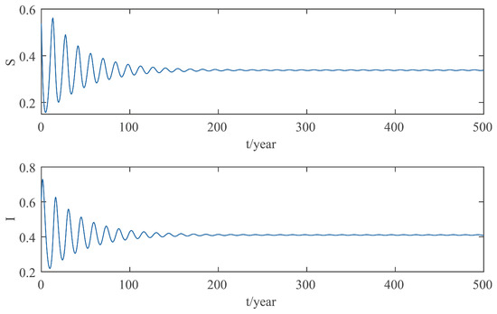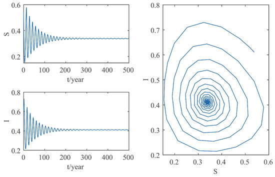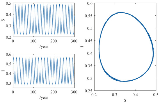 When , calculated by Equations (13) and (14), . When , due to Theorem 3, is locally asymptotically stable and when , is unstable; and system (2) undergoes a Hopf bifurcation near when . It can be calculated from Equations (26)–(30) that , , and thus, system (2) displays stable and forward Hopf bifurcation periodic solution near equilibrium by Theorem 3. We choose , which is about 20 days, and the positive equilibrium of system (2) is locally asymptotically stable as shown in Figure 5. Then, we choose , which is about 110 days, and a stable and forward Hopf bifurcation periodic solution appears near the positive equilibrium of system (2), as shown in Figure 6. The numerical simulation results are consistent with the theoretical analysis.