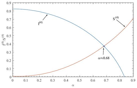 Moreover, when and , , , , , , it is found that , in our calculations, and thus, the system has two equilibrium , and the disease-free equilibrium is unstable by Theorem 2. We draw the dynamic change curve of equilibrium under different control intensities, as shown in Figure 7. It is easy to find that with the increase of , increases and decreases, which means the bigger the intensity of control, the smaller the number of infected M. alternatus that eventually reach stability. When the value of is more than about , infected M. alternatus will disappear, which corresponds with the previous analysis.