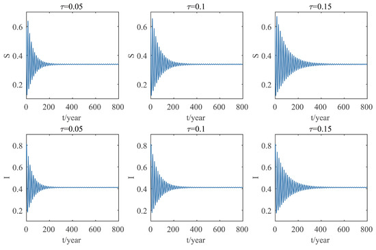According to Figure 8, when , the system will eventually reach a stable state without time delay. Moreover, with the increase of α, the time needed for the system to reach stability decreases correspondingly, so the difficulty of control and investment cost decrease correspondingly. In addition, when , it will take a lengthy time although the system finally tends to be stable. During this period, the disease is still unstable and causes damage to the forest. Therefore, in this case, the control measures should get timely adjustment to improve the intensity of control, so as to improve control efficiency to shorten this time. Combining with Figure 7, we can also illustrate the necessity of increasing the value of α. It can be observed from Figure 9 that when the time delay exists, the control will take effect later, and the time required for the system to reach stability will be longer; thus, the loss will be greater. However, means that there is no time delay of the control to take effect. When we take measures to protect trees such as nematicide injection, considering the limitation of detection technology, nematicide injection may not be carried out in time. This will cause a huge hidden danger for the spread of PWN. Therefore, the ideal situation of is difficult to achieve in practice. However, we can shorten this delay in other ways. For example, we can reduce the time delay of control to take effect by expanding the range of trees injected with nematicide, increasing the number of injections and giving them before the emergence of larvae.