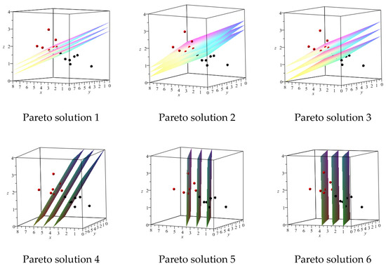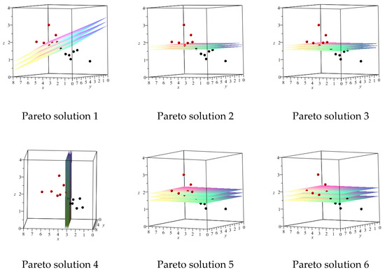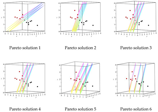 We used the dataset for our MOP models to obtain 100 Pareto solutions. We have considered 6 Pareto solutions out of 100 Pareto solutions obtained for each MOP for further investigation. In Figure 2, Figure 3, Figure 4 and Figure 5, we have considered a suitable viewing angle for each specific sample (6 Pareto solutions) to have a better view of the separating hyperplanes for MOP models. Additionally, in Table 2, Table 3, Table 4 and Table 5, the results obtained for the same Pareto optimal solutions are displayed.