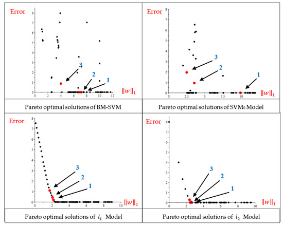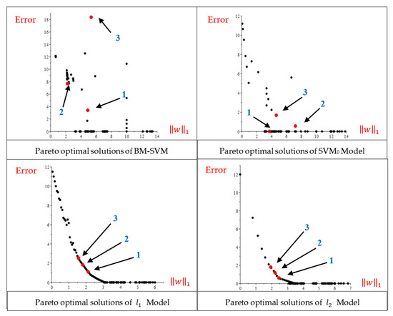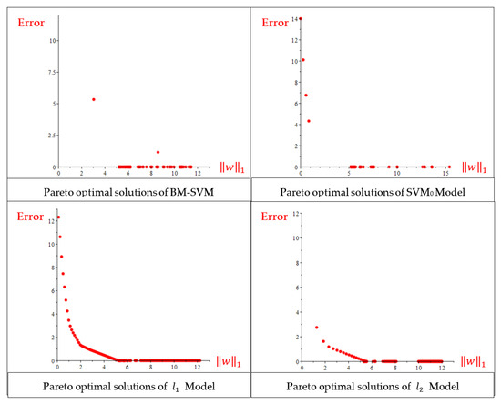 For BM-SVM MOP, as shown in Table 12, for the first and second Pareto solutions, four components of vector are equal to zero, and the error values are zero. Additionally, compared to the results of the single-objective model, a smaller value for the has been achieved.