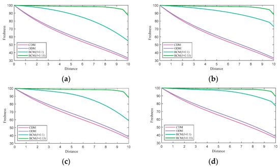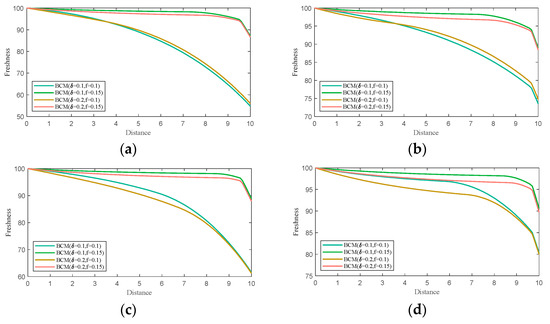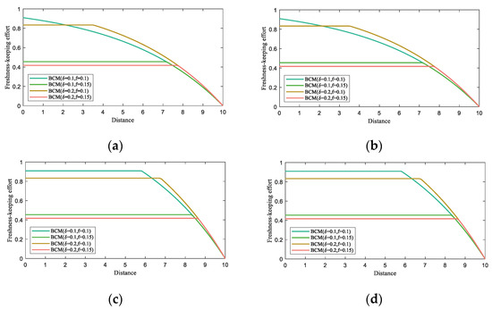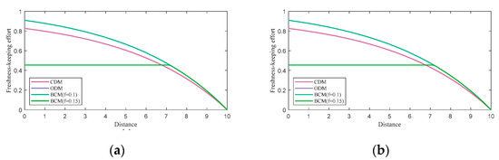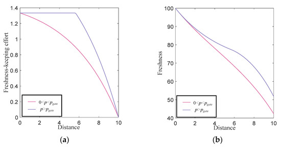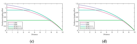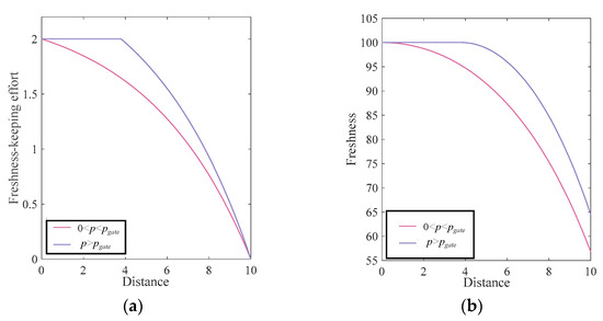 - When , the retailer does not modify their freshness-keeping strategy, and the freshness keeping scheme decreases with distance. The optimal freshness keeping scheme and relevant optimal freshness are shown as follows: