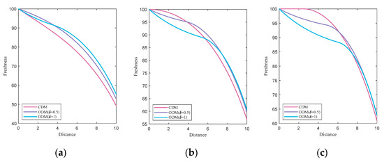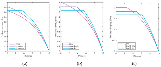 - When , the freshness keeping scheme decreases with distance; thus, , which decreases with the overconfidence degree.
