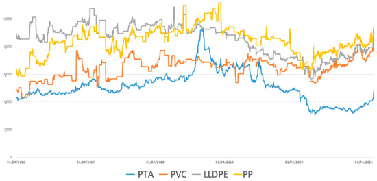 Run chart (C) of PTA, PVC, LLDPE, and PP futures prices. Notes: The four independent variables of futures contracts were the daily closing price in the petrochemical industry from the Wind database. (1) PTA futures as quoted in China’s Zhengzhou Commodity Exchange (2) PVC, (3) LLDPE, and (4) PP futures as quoted in the Dalian Commodity Exchange.