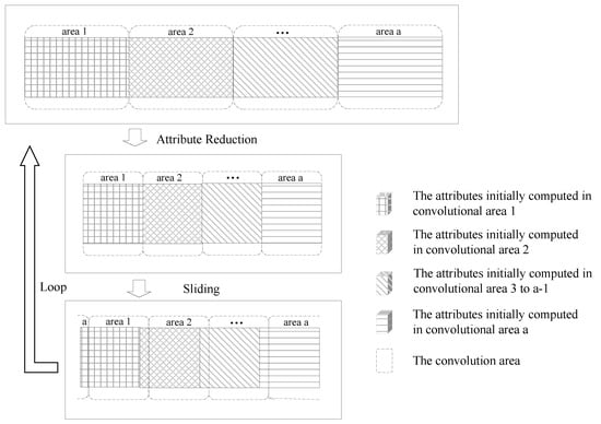 Form 2: Batch form. As shown in Figure 3, multiple convolutional regions slide a certain distance in the same direction in the form of a sliding window. In batch form, the attributes are divided into multiple convolutional regions, slide after the attribute reduction, and then the attribute reduction repeats. The current calculation window in the loop is based on the last convolutional region attribute reduction, sliding in a new batch of attributes and sliding out a small batch of old attributes.