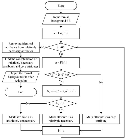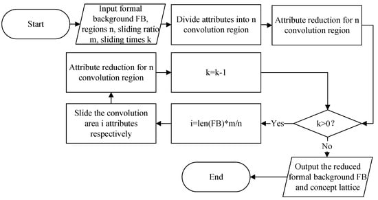 The concept lattice reduction based on the new difference matrix requires regenerating the concept and repeatedly performing merge operations at each slide. This results in excessive redundancy in the calculation process and disqualification for the convolution calculation model. The concept lattice reduction algorithm based on attribute features is a classical attribute reduction algorithm with excellent performance compared to other algorithms. Under the requirements and , we can compute core and relative necessary and absolute unnecessary attributes with a time complexity of . The algorithm flow chart based on attribute characteristics is shown in Figure 5.