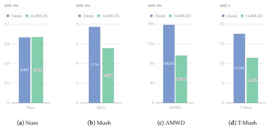 As shown in Table 3 and Figure 8, the proposed CLARA-DC is more efficient than the classical reduction algorithm. The units in Figure 8a–c are milliseconds, whereas the units in Figure 8d are seconds.
