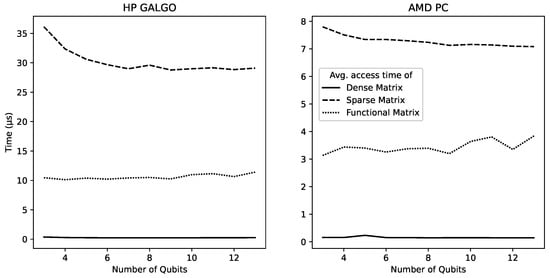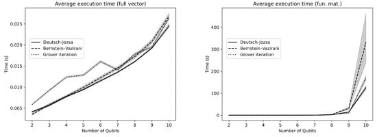As for the execution time in Figure 14, it is shown to be growing exponentially as expected in both charts. The Bernstein–Vazirani algorithm is shown to be the slowest because of how we implemented the gate application functional matrix. It greatly benefits from the number of controls or anti-controls. Bernstein–Vazirani’s oracles are composed of gates with only one control, while Grover’s have a greater number of them.