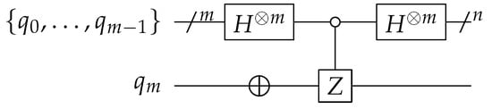 Let be the quantum gate that implements the “Inversion About the Mean” operator. Its circuit can be seen in Figure 10. This operator is applied once at the end of each Grover iteration. For the sake of efficiency, the used at the last Grover iteration has one less gate, since it does not affect the results of the measurements that will be performed just after its application. It just affects the phase, which will be lost regardless. The circuit of this gate is the one in Figure 11. This gate cannot be used in any other iteration, for this phase change will affect the result otherwise.