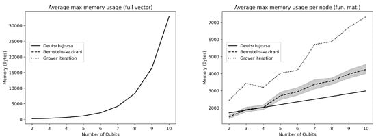 The lowest growth is that of the Deutsch–Jozsa algorithm execution, since each qubit only adds a measurement, that can be decomposed into multiplying by a projection matrix and by a scalar. We do not take into account the two extra Hadamard gates because of our functional matrix. The number of gates applied in the Bernstein–Vazirani algorithm ranges from 0 to n. On average, increasing the number of qubits by one will increase the number of operations by two, doubling the growth rate of the Deutsch–Jozsa algorithm execution. In spite of this, it is still linear. Finally, for Grover’s algorithm, the number of gates depends on the function to be implemented. Since we have tried to use the least possible number of qubits for each logic function, that means that adding one qubit increases the complexity of the oracle we have built. That is why it shows the highest memory usage of all algorithms.