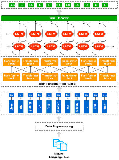 First, considering the high ambiguity and diversity of Chinese texts and the problem of understanding context semantics, we chose the BERT model tailored for Chinese. It has been pre-trained on a large Chinese corpus, making it adaptable to Chinese texts and able to capture the characteristics as well as the patterns of the Chinese language. In addition, BERT, which emphasizes the meaning of words in context as opposed to other models such as Word2vec and Glove, was chosen due to the ambiguity and diversity of natural language, and it has been trained on domain-specific word embedding for equipment maintenance knowledge, potentially improving the quality of subsequent extractions. Second, due to its bidirectional and synchronous nature, Bi-LSTM further emphasizes the importance of semantics. Finally, in the decoding part, CRF can improve the accuracy of label prediction by learning the rules of NER, in contrast to the traditional Soft-max method, which simply takes the predicted labels with the highest predictor scores.