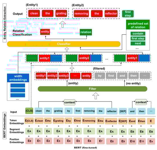 First of all, we split the input sequence by adding an identifier (CLS) at the beginning of the sequence and also by using the identifier (SEP) to separate two adjacent clauses. In this case, the output embedding of each word in the sequence consists of three parts: Token Embedding, Segment Embedding and Position Embedding. To jointly extract entities and relations, we added classifier tokens to classify entity and relation, where the relation types are obtained from a set of predefined relations. In addition, we added filters to clean out the non-entity types, as shown in Figure 3. Thus, we obtained a sequence containing both entity labels and relationship labels, and then the sequence vector was fed into the bidirectional Transformer for feature extraction, which yields a sequence vector with rich semantic features. The Transformer is a deep network based on a “self-attentive mechanism”, which mainly adjusts the weight coefficient matrix to capture word characteristics by the degree of association between words in the same sentence: