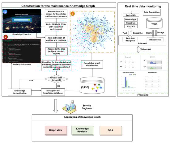 In this article, an equipment maintenance system is set up to provide a detailed demonstration of the construction and application of the KG in the maintenance process, as shown in Figure 4. In Figure 4, ➀ represents the page used for knowledge extraction, where maintenance engineers can upload texts related to equipment maintenance, such as maintenance manuals, maintenance reports or textual descriptions of their practical experience. The uploaded texts are processed by the BERT-Bi-LSTM-CRF joint model to extract entities and relationships, which are then represented as triplets. Each triplet consists of a head entity, a tail entity and the relationship between them. At this stage, ambiguous or conflicting knowledge may be found in the extracted triplets due to high redundancy. Not only does this take up a large amount of storage space, but it also has a major impact on the quality and timeliness of the subsequent construction of the KG. Hence, to calculate the similarity between entities, the semantic-based Cosine similarity algorithm is used in combination with the IDF, which is shown in ➁. If the calculated similarity exceeds a predefined threshold, it is determined that these entities are redundant and need to be de-duplicated, i.e., only one entity is retained while the rest of the similar entities are discarded. This process eliminates the effects of redundant knowledge and enables the construction of a concise and accurate KG. Once the above steps have been completed, the de-duplicated triplets are stored in the database (➂). At this point, the equipment maintenance KG is constructed and can be accessed by the system to implement maintenance functionalities.