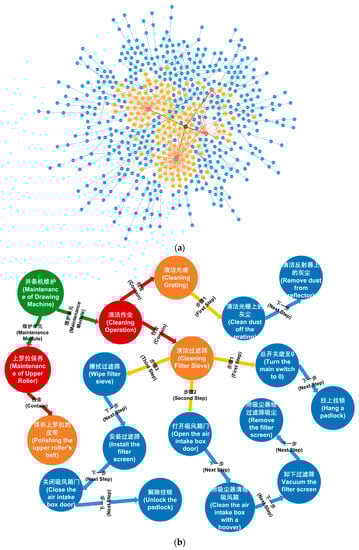 This paper takes the maintenance manual and maintenance report of the warping machine as an example. It contains operations such as top roller maintenance, overhaul, cleaning and repair. Entities and relationships are extracted using a joint model, and the similarity between entities is computed for de-duplication. The data is then stored in a graph database. Neo4j was chosen for this project because it can better represent the associations and attributes between entities. It also offers good flexibility and scalability, making it suitable for dealing with the characteristics of the constantly growing and changing textual data in equipment maintenance. In addition, Neo4j provides support for Atomicity, Consistency, Isolation and Durability (ACID) transactions. This means that Neo4j can ensure data integrity and consistency as data is modified, which is critical for a reliable and consistent asset maintenance system. The overall graph representation shown in Figure 5a,b specifically lists the extracted entities and relationships (the objects extracted in this paper are Chinese texts, partially translated into English for a more intuitive understanding). It can be seen that each node represents an entity and that the relationships between nodes are from subject to object. For example, top roller maintenance and cleaning operations are two aspects of warping machine maintenance, while cleaning operations include more specific units such as cleaning, grating and cleaning the filter sieve. Each unit has specific operating procedures. Specifically, the original text “Cleaning grating requires first clean dust off the grating and then remove dust from reflector” is extracted by the joint model. “Cleaning grating”, “ Clean dust off grating” and “ Remove dust from reflector” are entities, while “first step” and “next step” are predefined relationships between different entities. It is obvious that the “first step” of “Cleaning grating” is “Clean dust off grating” and the “next step” of “Clean dust off grating” is “Remove dust from reflector”.