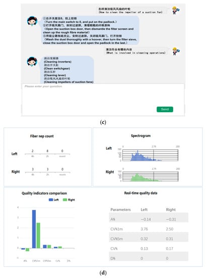 In summary, the construction of the KG for maintaining the warping machine is complete, and the system is ready for use. To provide a comfortable interactive experience for service engineers, the system offers a convenient knowledge search, avoiding the drawbacks of poor readability and the lack of flexibility in Cypher. Maintenance personnel can quickly find the information they need, improving work efficiency. The system also provides a basic knowledge question-and-answer function, allowing maintainers to ask questions about maintenance-related knowledge of the machine and providing guidance and support. There is a description of the system based on specific examples. In Figure 6a, the graph shows all the cleaning units involved in the cleaning operation, and the content of each unit is displayed in the “Detailed Information” panel, making it convenient for maintainers to view. Figure 6b shows the graph of the cleaning of the exhaust fan, and the entities and relationships in the graph are transformed into natural language and displayed in the “Detailed Information” panel, making it easier to read. Here are the specific steps for cleaning the exhaust fan. Figure 6c shows the question-and-answer page, where enquiries can be made about the entities and relationships in the KG, such as “What does “cleaning operation” involve?” and “How do you clean the exhaust fan?” Furthermore, the system has added an important real-time data monitoring function, which monitors key parameters such as CV, AV and spectrum. It provides real-time feedback on the warping machine’s operating status, providing reliable data collection for future bidirectional knowledge and data driving.