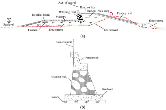 The schematic diagram of one cross-section of a current seawall and the old seawall in China. (a) A typical section. (b) The detail of the retaining wall of our sea.