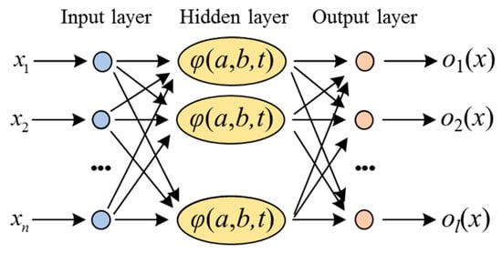 The wavelet neural network (WNN) is proposed by combining wavelet analysis with neural network theory, and its fusion architecture is demonstrated in Figure 2. Figure 2 represents the wavelet basis function, a and b denote the extension factor and translation factor of the wavelet basis function , respectively, t denotes time. denotes the input variable, n is the number of input layer nodes, means the output variable, and l is the number of output layer nodes. The wavelet basic function is adopted as the activation function of the hidden layer nodes [26]. The weights from the input layer to the hidden layer and the thresholds of the hidden layer are replaced using the extension and translation parameters of the wavelet function, respectively.