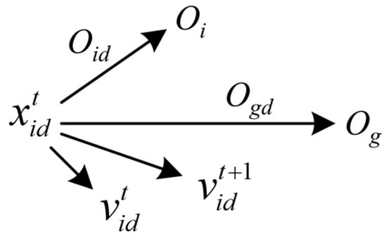 CPSO is developed from the traditional Particle Swarm Optimization (PSO) algorithm. PSO treats the values of the parameters (weights, extension factors, and translation factors) in the WNN model as the position coordinates of particles in a D-dimensional space. D is the total number of parameters in the WNN model. The particle position coordinate vector is denoted as X. The particle velocity vector is denoted as V, which corresponds to the adjustment increments of the parameters. Each particle also has a fitness value E, which represents the error between the measured data and the output values of WNN. When PSO is performed to optimize the parameters of the WNN model, the forward propagation process of WNN remains unchanged. In the backward propagation process, the position and velocity of the i-th particle are and , respectively. The particle’s velocity is adjusted, and the particle’s position is updated based on the local best value and global best value. Meanwhile, the fitness value E is calculated. On this basis, the error backpropagation process can be realized as written in Equation (10). Figure 3 illustrates this process, represents the d-dimensional component of the velocity vector of the i-th particle at the t + 1-th iteration, denotes the d-dimensional component of the velocity vector of the i-th particle at the t-th iteration, represents the d-th component of the i-th position of the t-th iteration vector, represents the d-th component of the i-th particle at best historical position, is the d-th component of the global best position of the i-th particle, oi is the historically optimal position, and og is the global optimal position.