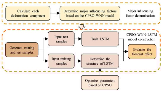 According to the importance values of the various influencing factors, the major influencing factors of seawall deformation can be determined finally, and the whole procedure based on CPSO-WNN is illustrated in Figure 4.