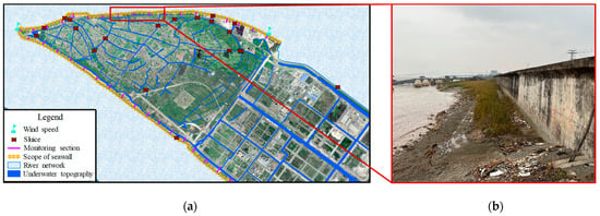 (a) The layout diagram of the seawall layout, (b) photo of the seawall upstream side.
