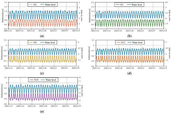 Water level and settlement monitoring data series of: (a) N1, (b) N3, (c) N9, (d) N12, and (e) N14.