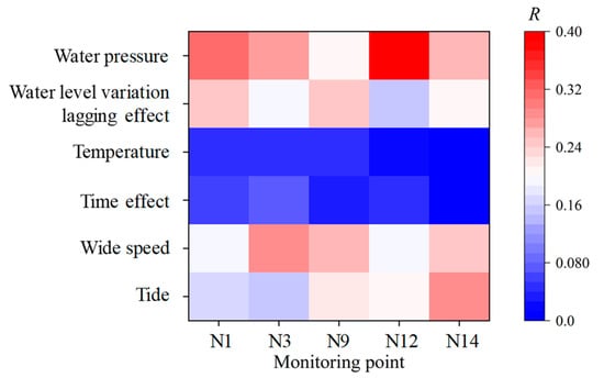 Eventually, the normalized importance value R of various influencing factors for different monitoring points is shown in Figure 11. In Figure 11, temperature and time both had a weak influence on seawall settlement; therefore, they cannot be regarded as major influencing factors. The reason behind this phenomenon was mainly attributed to the fact that the seawall is located in a mild region, where temperature variation has a relatively slight effect on the seawall settlement. Further, the time span of seawall settlement monitoring data covers only one month, and the measured values cannot exhibit an obvious trend over time. As a result, the time effect did not exert a noticeable influence on the monitoring effect.