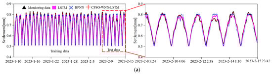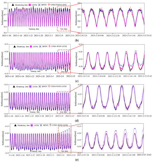 In addition, there are three different types of prediction models based on training samples by using the LSTM and the BPNN according to Equation (38). The fitting and prediction results of the LSTM model, the Back Propagation Neural Network (BPNN) model, and the proposed model of five monitoring points are exhibited in Figure 13. In the locally enlarged images, three models fitted most of the monitoring data well; the over-fitting problems did not exist in the three models. The R2 and RMSE of three models for different monitoring points were calculated, and the statistical results are illustrated in Table 1.
