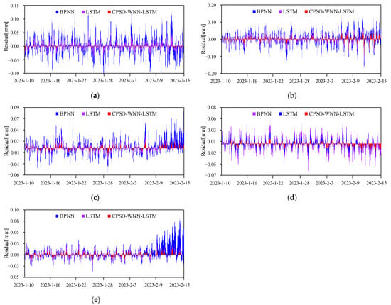 The fitting and prediction residuals of three models for different monitoring points: (a) N1, (b) N3, (c) N9, (d) N12, and (e) N14.