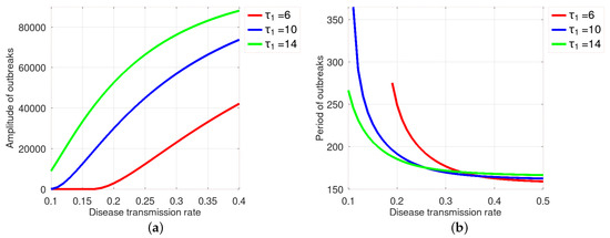 In this section, we present some numerical simulations to verify the effect of disease transmission rate , disease duration and the period of immunity waning on the amplitude and the period of the outbreaks for model (1) without vaccination. Figure 2 shows that increasing while keeping and fixed, increases the amplitude and decreases the period of outbreaks in the model (1) without vaccination. The amplitude becomes larger with the increase in disease duration . On the other hand, the period of outbreaks decreases with the increase in the disease transmission rate . Furthermore, the period approaches the sum of disease duration and period of natural immunity for large values of the disease transmission rate, , where T is the period of outbreaks. On the other hand, the amplitude of outbreaks approaches the total size of the population for large values of .