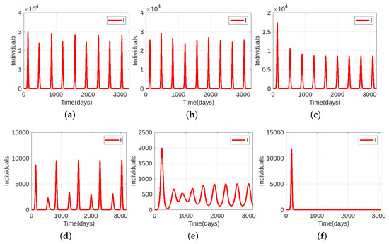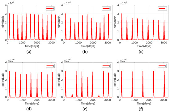 The size of the infected compartment for model (1) with the initial conditions , the parameters , and the values of as follows: (a) ; (b) ; (c) ; (d) ; (e) ; (f) .