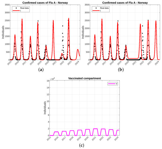 Numerical simulations of model (1) describing the confirmed cases of Influenza A in Norway [45], for the initial conditions N = 5,379,475 , where 5379475 is the population of Norway and is the percentage of covered population in the collecting data [46], , and parameters , are given by (16), where , and , , , . Time unit is week. (a) Constant value of , (b) variable taking into account COVID-19 (see the explanation in the text), (c) the number of vaccinated individuals with the annual number of doses corresponding to the data.