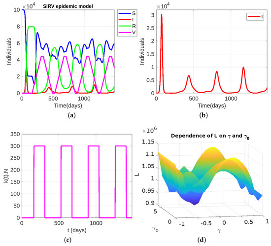 Numerical simulations of system (1). (a) Oscillations of four compartments are close to periodic with a slight increase in , (b) zoom in on , (c) vaccination rate, (d) cost function L depending on . Initial conditions , and parameters . The minimal value = 912,940.07 is reached for .