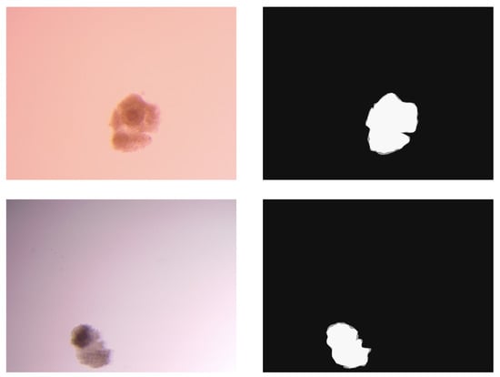 Images from 100 COCs were captured both at the immature stage (0 h of maturation) and at the mature stage (22 h post maturation). This was accomplished using an Olympus stereomicroscope coupled with a ToupCam camera and facilitated by ToupView software (version 3.7.13270.20181102). All images were acquired with a consistent magnification of 56×, centering a single oocyte’s zona pellucida in the middle of the field of focus. Images were stored as .png files with a resolution of 2592 × 1944 pixels in RGB format. A total of 100 paired images of COCs were presented to three experts to annotate the COC area, using the ImageJ (version 1.53j) software. Finally, a total of 200 images and 200 × 3 masks were collected. The images and the masks were downscaled to reach the final dimensions of 192 × 240 × 1. The method of majority-vote [] was used to compute a GT and use it for evaluation purposes.
