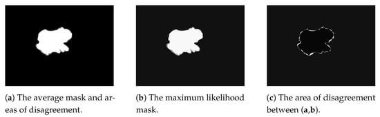 A comparison between the majority-vote ground truth and the maximum likelihood ground truth, which focuses on the areas of uncertainty. In (a), there is the majority-vote mask, with a gray zone on the borders, for the pixels of disagreement. In (b), there is the maximum likelihood mask, which can vary within the range of (0.0–1.0), since it is calculated using the confusion matrix identity of each expert. In (c), there is the zone of disagreement and alterations between case (a) and case (b).