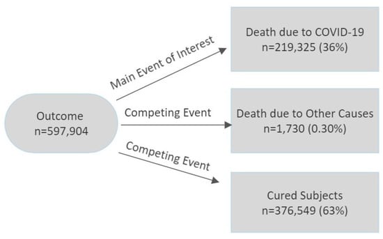 We analyzed data from subjects who had COVID-19 symptoms and were under observation from the date of symptoms to the date of death or exit from the study because they were cured or no longer in danger. Our time-to-event data were obtained from the Brazilian Ministry of Health for all COVID-19 patients from 1 January 2020 to 30 April 2021. Figure 1 summarises the main outcomes that we analysed on these data.