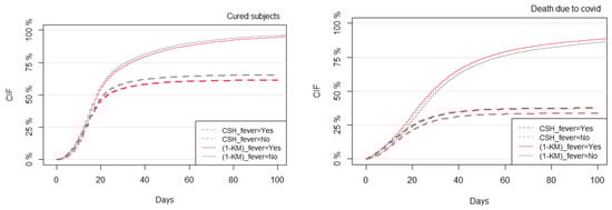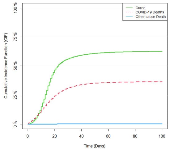Figure 2 shows the CIFs for cured subjects, death due to COVID-19, and death due to other causes, which were estimated non-parametrically using the Aalen–Johansen estimator. Here, the estimated probability of COVID-19 death was after the first 20 days from the day of symptoms and became after 30 days. Meanwhile, the likelihood of becoming cured was after the first 20 days and around after 40 days. Death due to other causes was found to be negligible, as the probability of death over time was slightly over zero. This is because, when compared to COVID-19 death and cured subjects, there were very few patients who experienced death due to other causes (only death due to other causes, whereas for COVID-19 death and for cured events, see Figure 1).