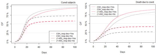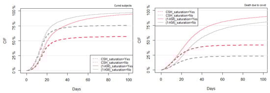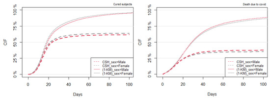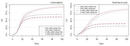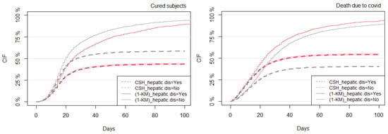 The objective here was to compute the CIFs based on the conventional technique (K–M) and then compare the results with the competing risks CSH approach. The K–M plot for COVID-19 death estimates the survival probability of subjects who did not experience COVID-19 death. The CIF can be obtained by plotting the complimentary function (1-KM), which estimates the cumulative risk of dying from COVID-19 over time, in the absence of the competing events (here, we treated all of them as right-censored times). Overall, Figure 3, Figure 4, Figure 5, Figure 6, Figure 7, Figure 8, Figure 9, Figure 10, Figure 11 and Figure 12 satisfied the proportional hazards assumption since risk curves do not cross during the analyzed period. A clear overestimation of the CIFs over time was observed under the K–M estimation technique compared with the CSH approach. The overestimation gap between the (1-KM) and CSH approaches was severe, mainly for COVID-19 death. For these reasons, the following results are shown for both the K–M and CSH approaches, but their interpretation is provided only under the CSH approach.