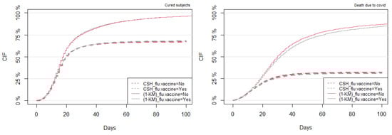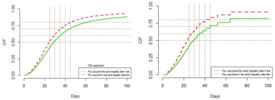 From the results obtained with the fitted regression models, the model-based predictions can be undertaken and compared by analyzing the subject’s risk with some specific given values for the exposures. As an illustration, let us predict the cumulative risk (CIF) of dying from COVID-19 for subjects with a certain flu vaccination status and chronic liver disease status, under both the CSH and SDH approaches. Figure 13 shows two specific groups based on the two considered subjects’ risk factors: group 1 is related to those who had been vaccinated for the flu and had no chronic liver disease; group 2 refers to those who had not been vaccinated for the flu and had chronic liver disease. From Figure 13 (left panel), it is observed that, at the beginning of the study, the CIF curves between the two groups appear to be similar until day 10. Then, the discrepancy of the CIF probabilities increases over time. In particular, in the CSH approach, the cumulative risk (CIF) of COVID-19 death reaches in 25 days for group 1, and in 30 days for group 2. Moreover, the CIF probability gap is almost similar from 30 days to more than 100 days. On the contrary, in the SDH approach, after 10 days, the discrepancy in the CIF probabilities between the two groups increased similarly until 25 days, but then later on and up to 70 days, this gap is even more than that under the CSH approach, and finally, after that period, the CIF curves appear to be flat (see Figure 13, right panel).