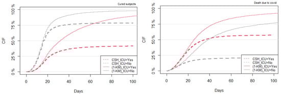 In this study, the ICU is considered a time-constant exposure, but more appropriately, one may also consider the ICU as a time-dependent covariate. Moreover, it could also be of interest to study its time-varying effect on the CIFs. Due to the presence of acute severe respiratory failure in a significant proportion of COVID-19 cases, hospitalization, admission to the Intensive Care Unit, and intubation are frequently necessary to treat these cases [25]. Thus, alternative approaches such as extension to multi-state regression models [26] or direct regression models based on binomial regression [27] could help with predicting such an objective, allowing one to model time-dependent covariates and time-varying coefficients. Furthermore, although the estimation technique by [11] is efficient to estimate the proportional SDHs, alternative approaches such as pseudo-value and binomial regression approaches have more flexibility to model the CIF directly through different link functions. Nevertheless, the interpretation of the regression parameters in all these approaches is direct but not straightforward, depending on the chosen link function. However, computation and graphical representation of the CIF curves between different risk factor groups are straightforward and always possible to help one make personalized individual clinical decisions.