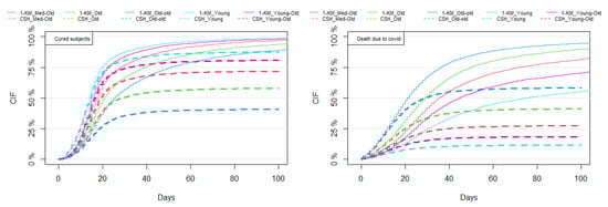 Furthermore, from the fitted regression models, model-based predictions were undertaken and evaluated by assessing a certain subject’s risk with the desired specified exposures. In the COVID-19 application, it was found that the SDH approach provides slightly higher estimated Cumulative Incidence Functions as compared with the CSH approach. Nowadays, competing risks data are found in many fields, ranging from medicine, where several types of oncology and therapeutic outcomes are studied simultaneously over time, to epidemiology, demography, and reliability, where, e.g., failure may be due to the breakdown of a mechanical device for several different causes. Therefore, the construction of accurate regression models for competing risks data based on the two discussed approaches (the CSH and SDH methods) is of potentially great interest in many other contexts and applied fields. Furthermore, based on the fitted models, all desired individual predictions of CIFs can be computed on the same data, i.e., the training data, but also on new data, i.e., the testing data, and prediction accuracy can be measured. The competing risks regression models described in this paper provide a very important foundation for obtaining accurate personalized predictions, on which, e.g., many current statistical learning and personalized medicine techniques are based.